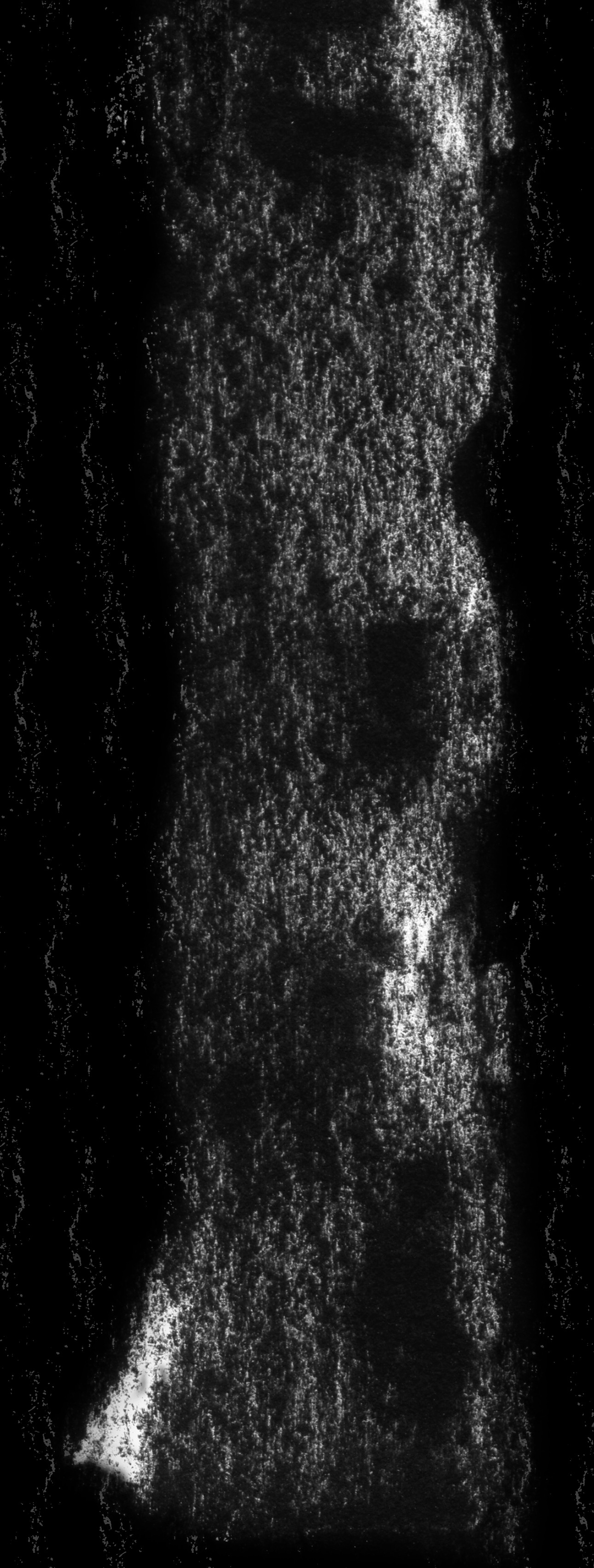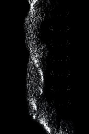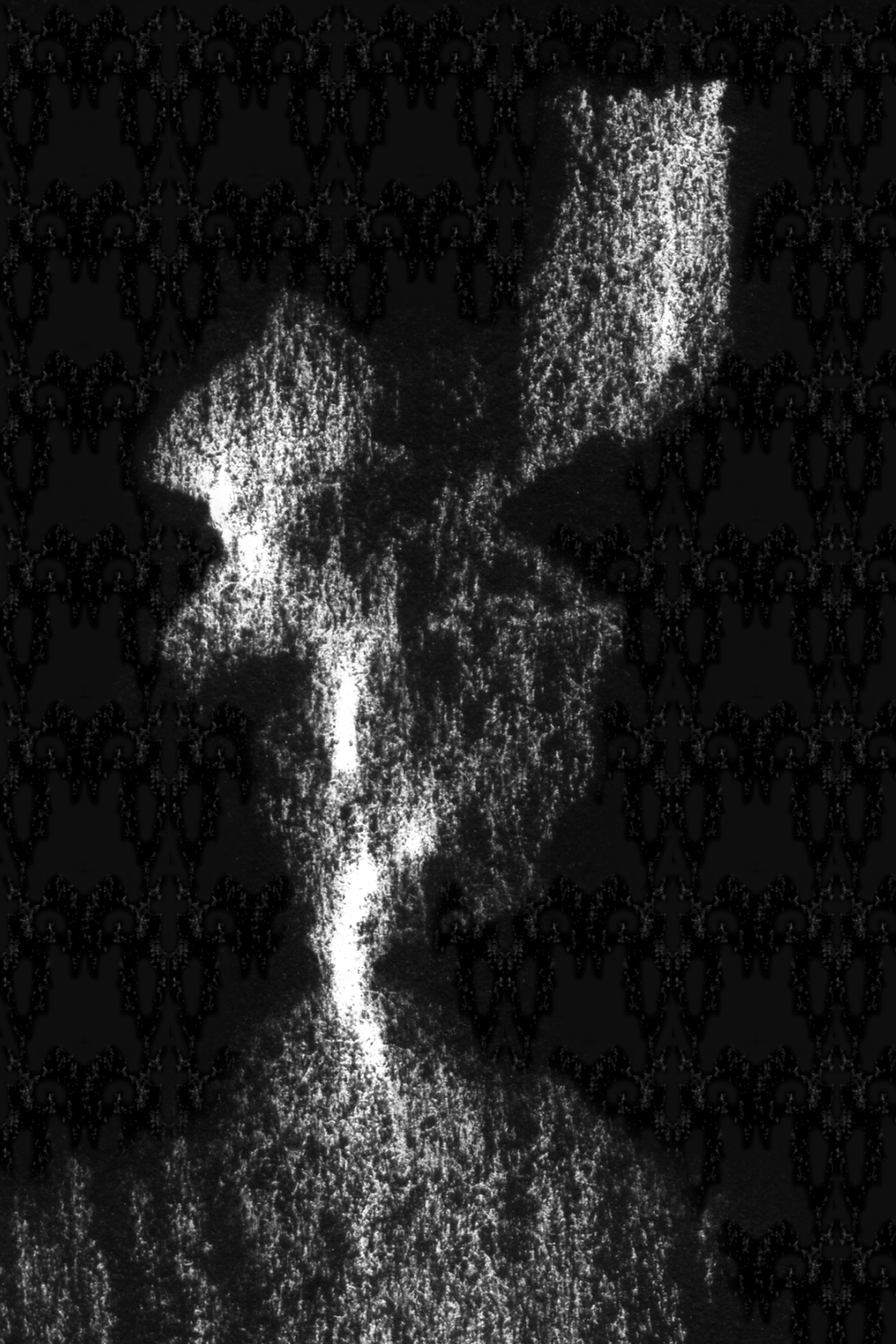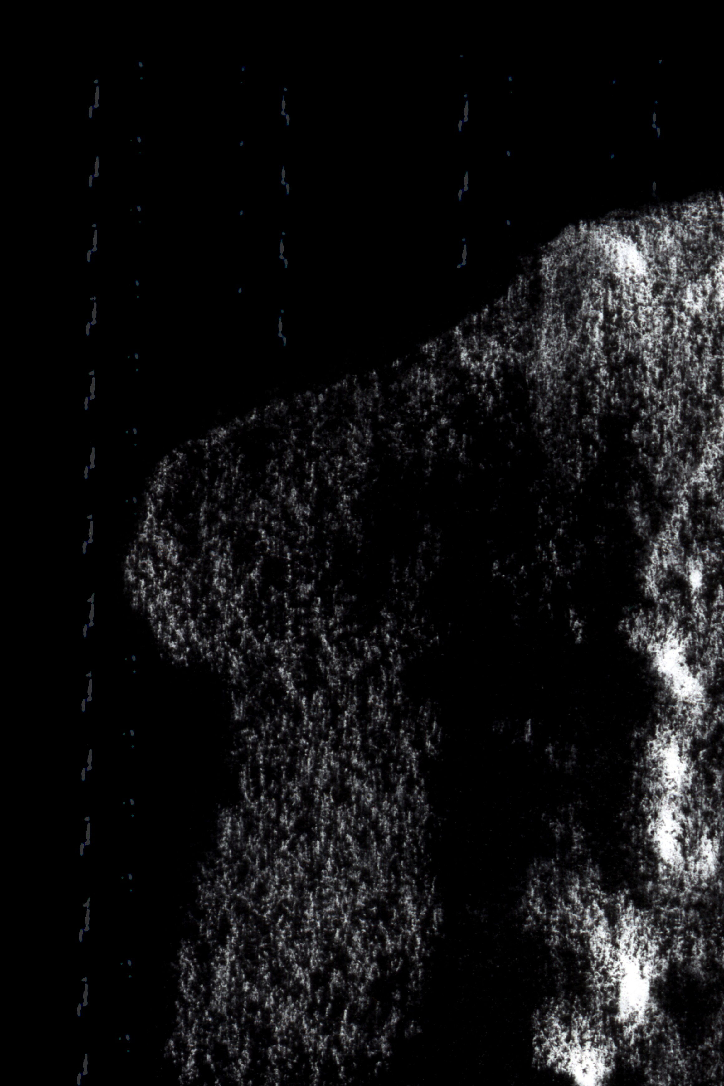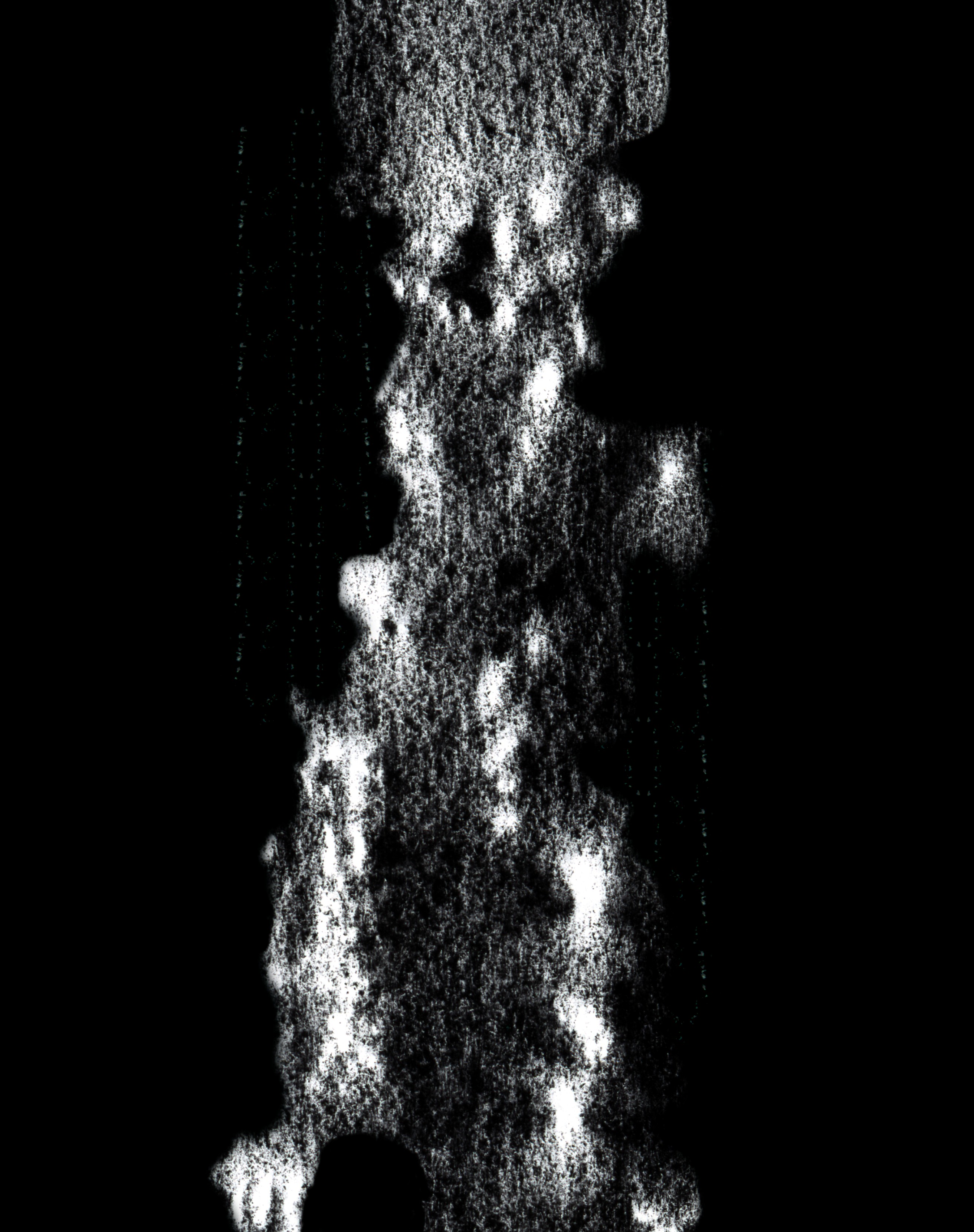 Ausgangspunkt ist die Frottage einer Baumrinde mit Kohle auf weissem Papier. Durch fotografische Negativumkehr wird der Abdruck zur weissen Form im Dunkel.