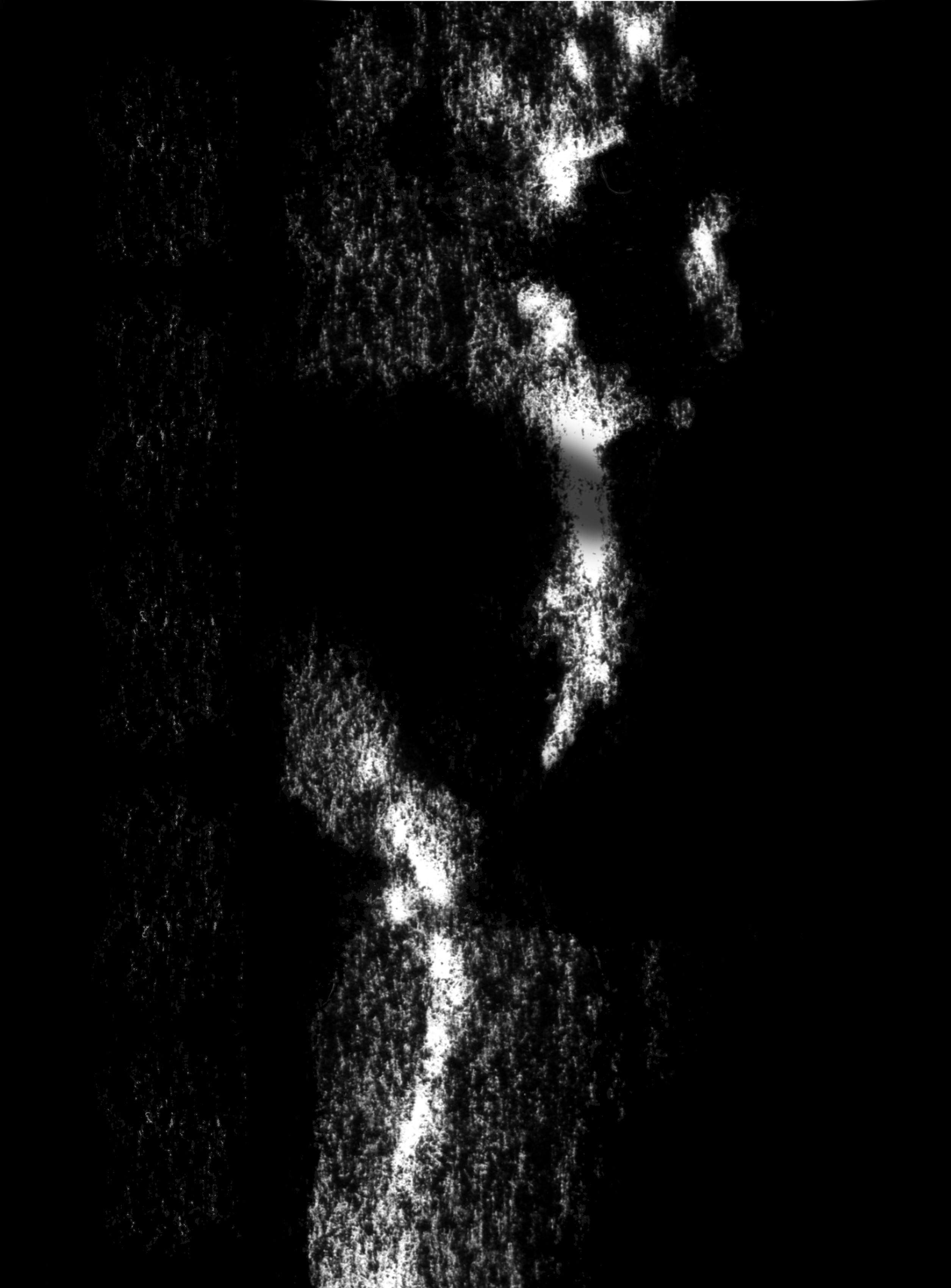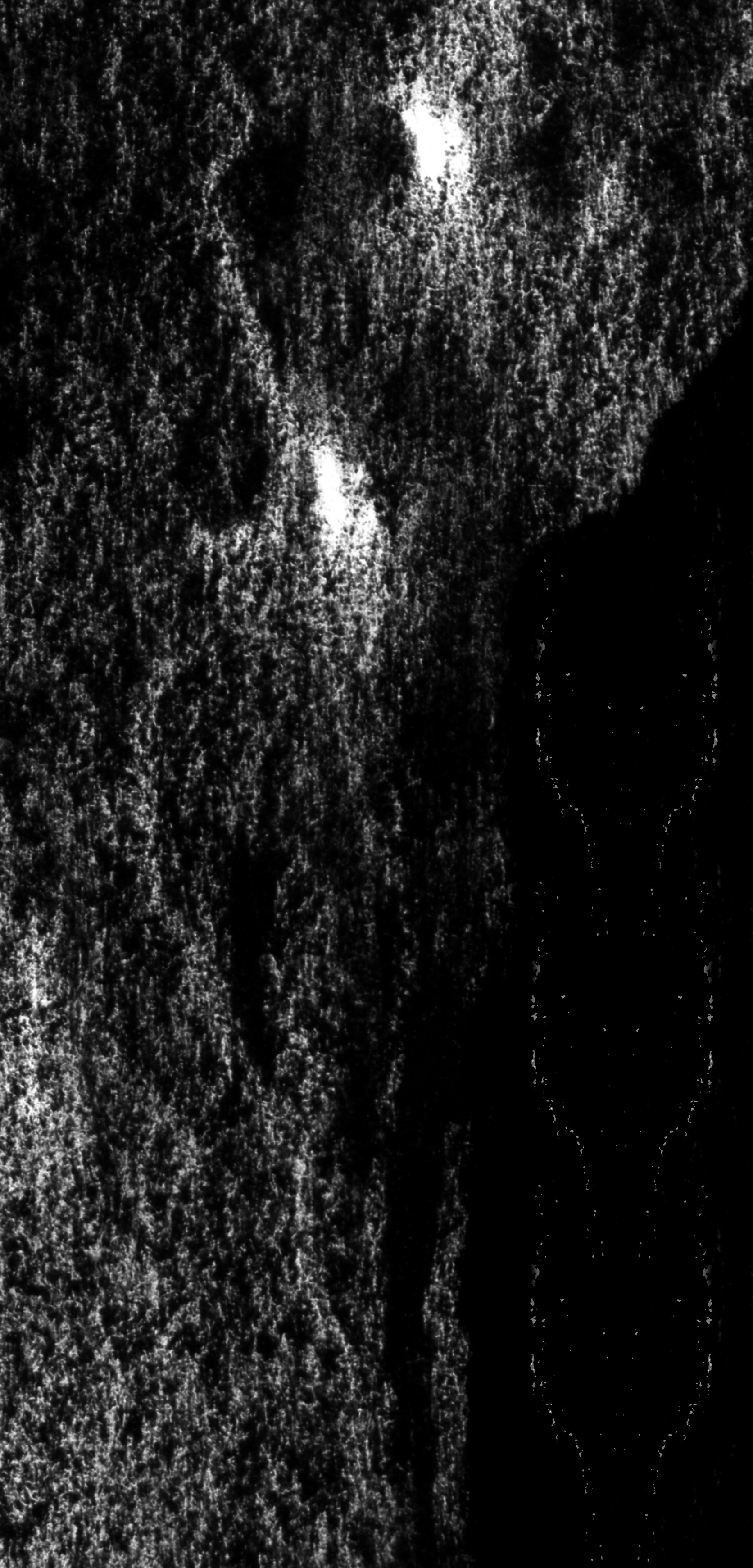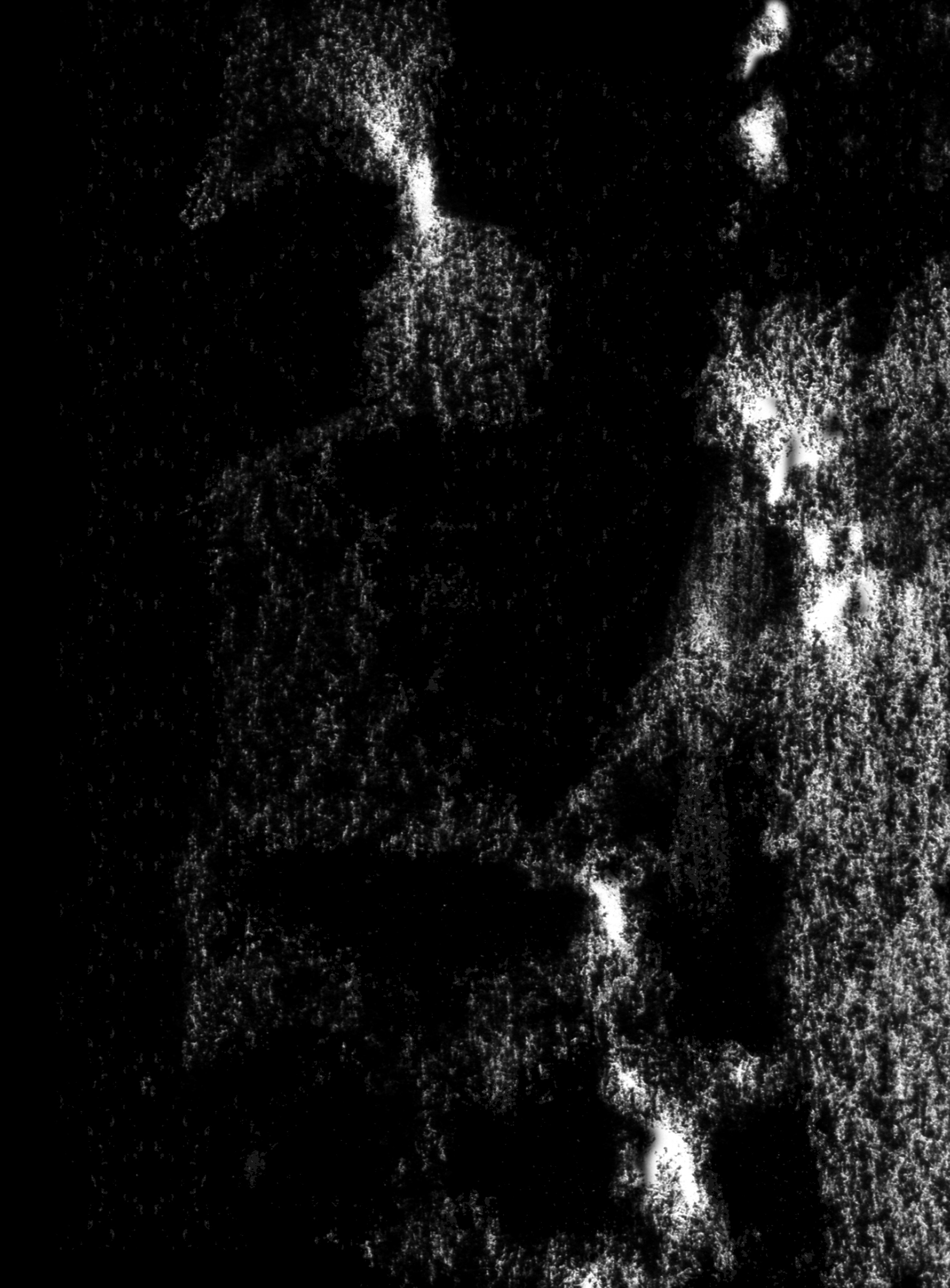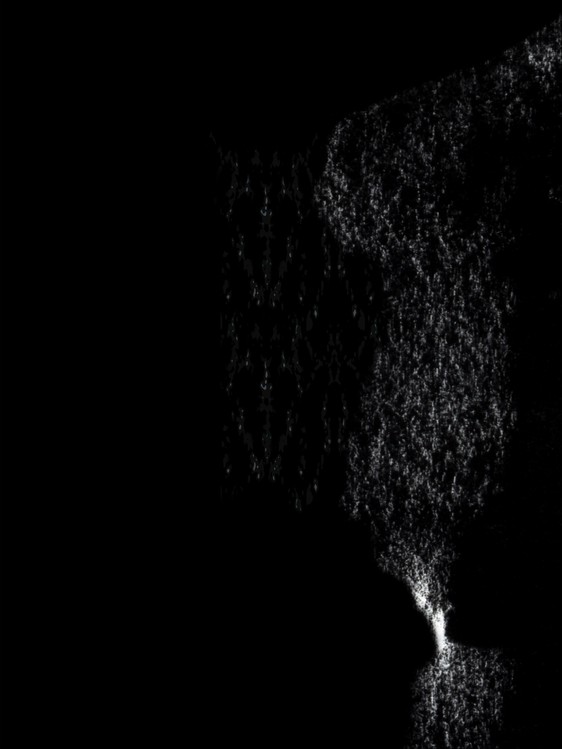 Ausgangspunkt ist die Frottage einer Baumrinde mit Kohle auf weissem Papier. Durch fotografische Negativumkehr wird der Abdruck zur weissen Form im Dunkel.