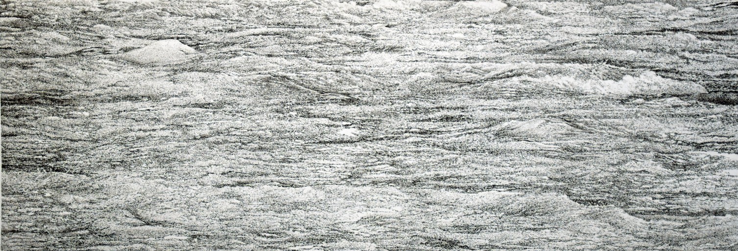 Sichtbar wird radikale Veränderung im selben Ort: Wasser und Licht formen sich ständig neu. In dichter Scribbling-Technik wird die Zeichnung selbst zum Träger von Zeit und Bewegung.